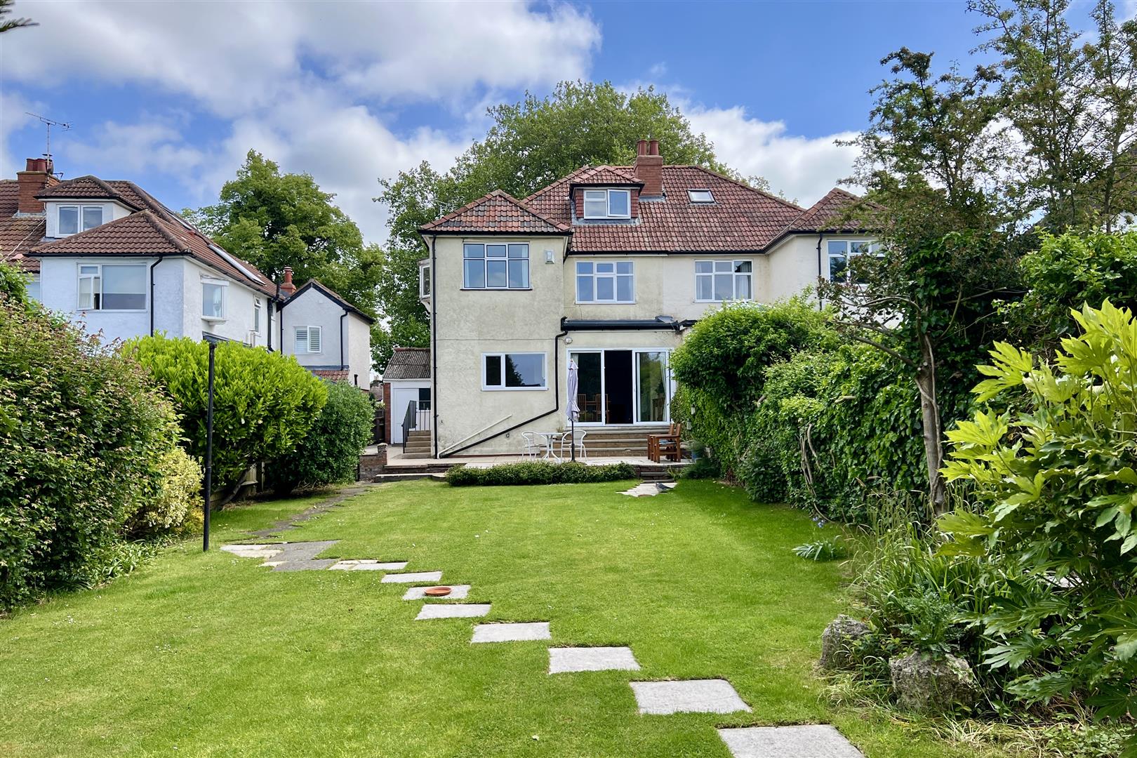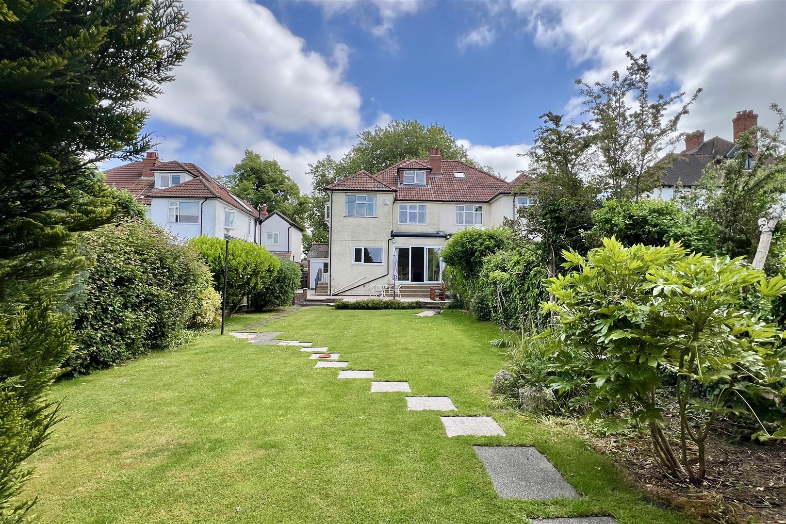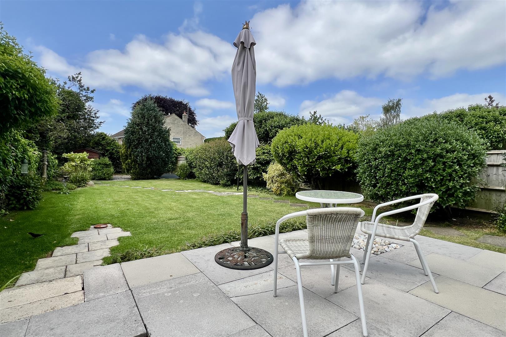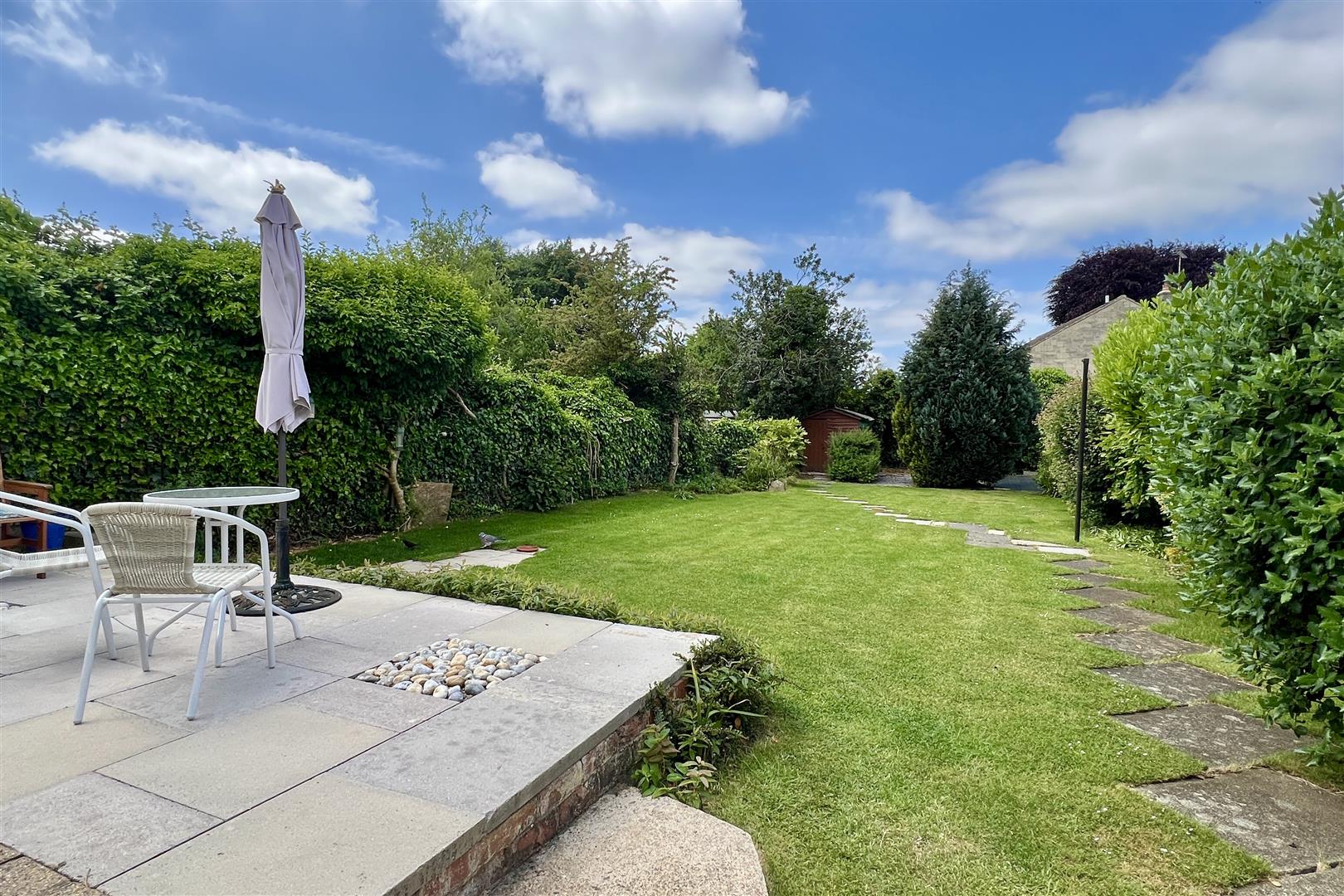 To the rear of the property is a south west facing garden (c.98’x34′). Steps lead down to a paved terrace with a lawn beyond with mature shrubs. To the bottom of the garden with a vegetable patch and garden shed. The garden is enclosed by wooden fencing. To the side of the property is a GARAGE (c.14’9×7’4) and pedestrian access to the front garden which provides plenty of off street car parking.