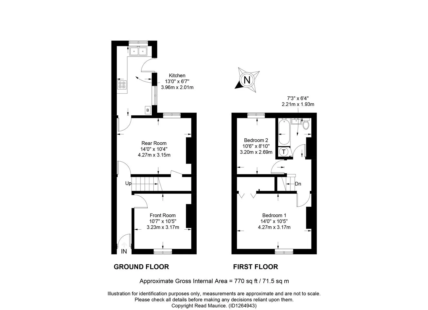 The ground floor comprises two reception rooms and a fitted kitchen, while the first floor features a wide landing, two bedrooms, and a family bathroom. To the rear, the enclosed garden extends approximately 72 feet and includes ornamental trees, a winding pathway, and a detached home office/garden room—ideal for remote working or creative use. Central heating is provided via a gas-fired boiler to radiators, and on-street parking is available without permit.