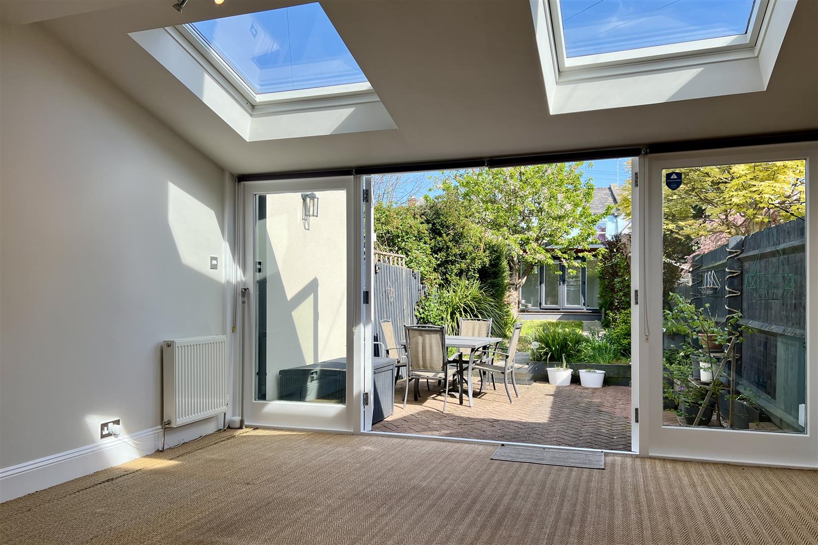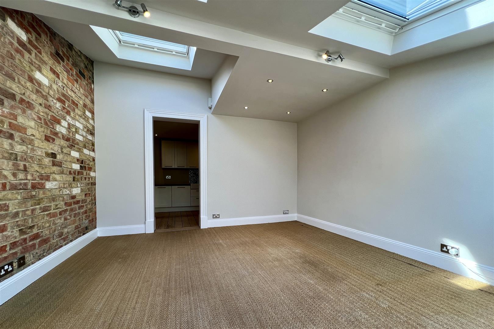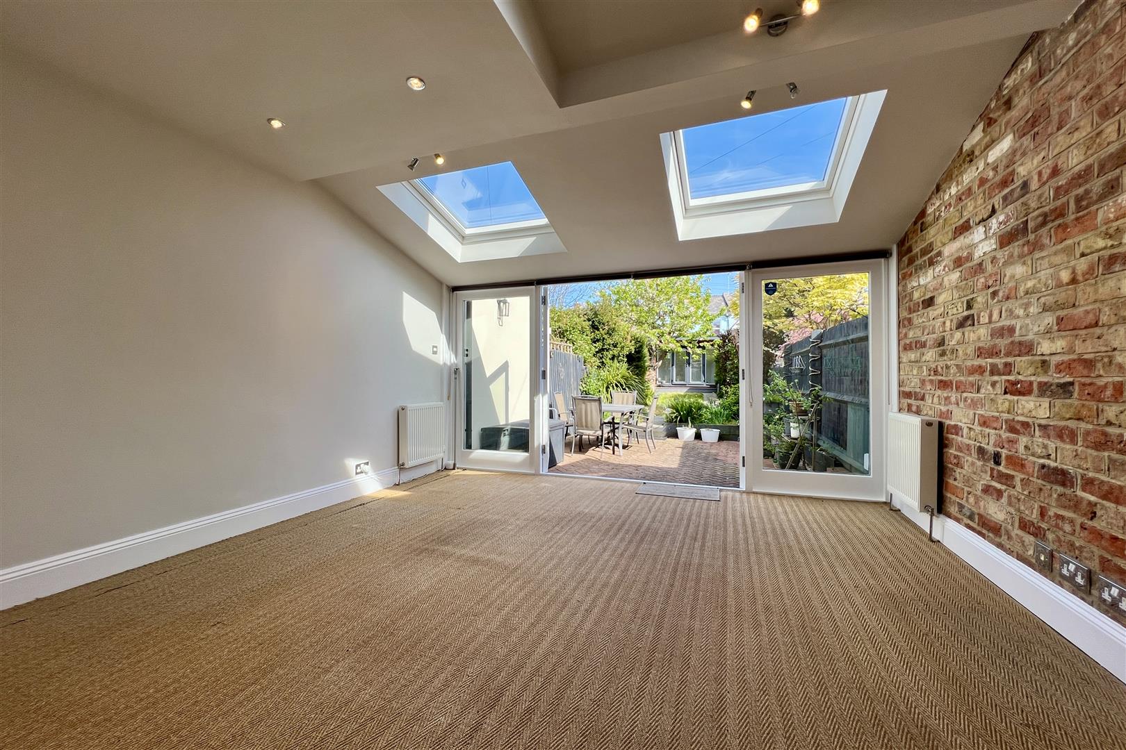 The entrance hall opens into a good sized kitchen/breakfast room which is fitted with modern units and again has a stripped wooden floor. A open access from the kitchen leads into the rear sitting room which is bathed in natural light having several roof windows, floor to ceiling windows and glazed double doors leading into the garden.