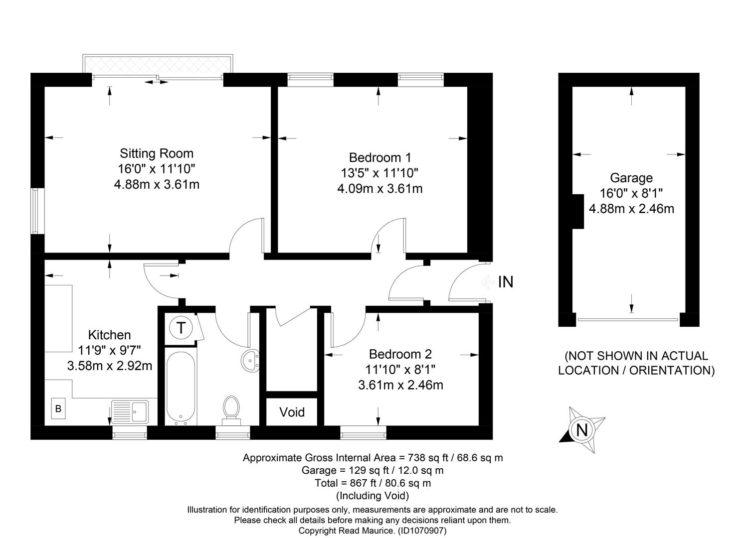 Entrance hall, sitting room, kitchen, 2 bedrooms and bathroom. Garage (in block)