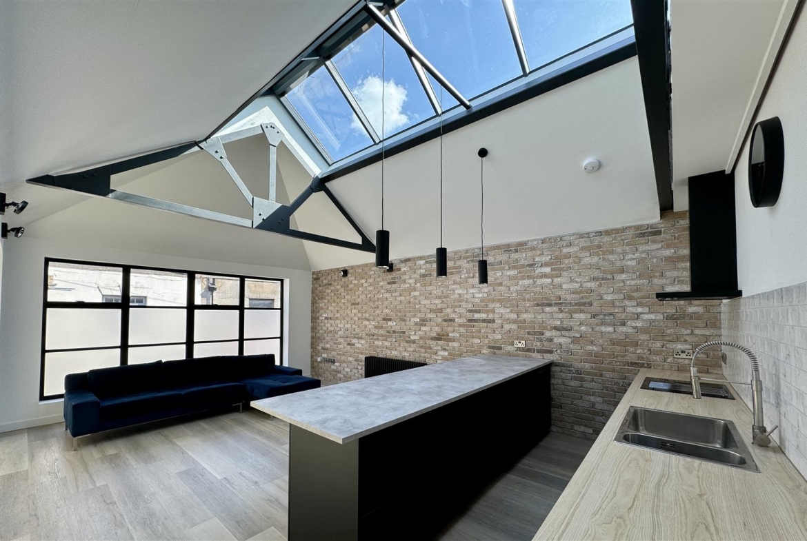 The front door opens into a entrance hall with a useful storage room behind double doors and a inner door leading to a taircase which leads up to the flat. The first floor features a spacious living space with a apex roof, part of which is structurally glazed making the room exceptionally bright. To one end is a modern fitted kitchen with appliances, lots of storage and a peninsular bar. Hidden of the living space is an inner hall with access to the master bedroom with ensuite and a second guest bedroom. Both rooms have fitted wardrobes.