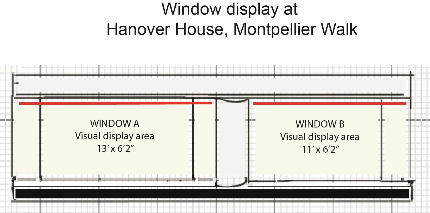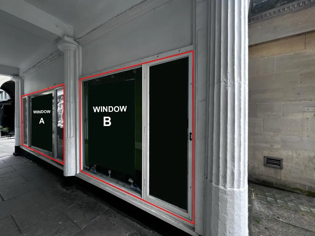 Window B: c.13′ x 6’2″ (3.9m x 1.82m) of visible display area with single access door