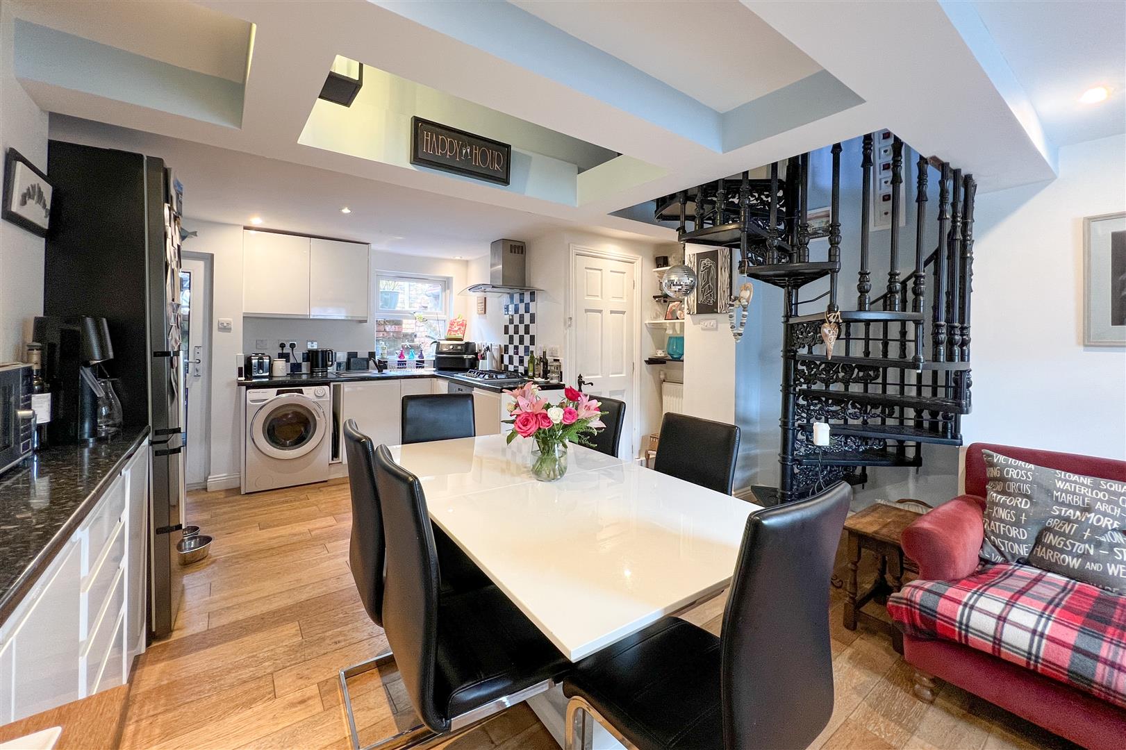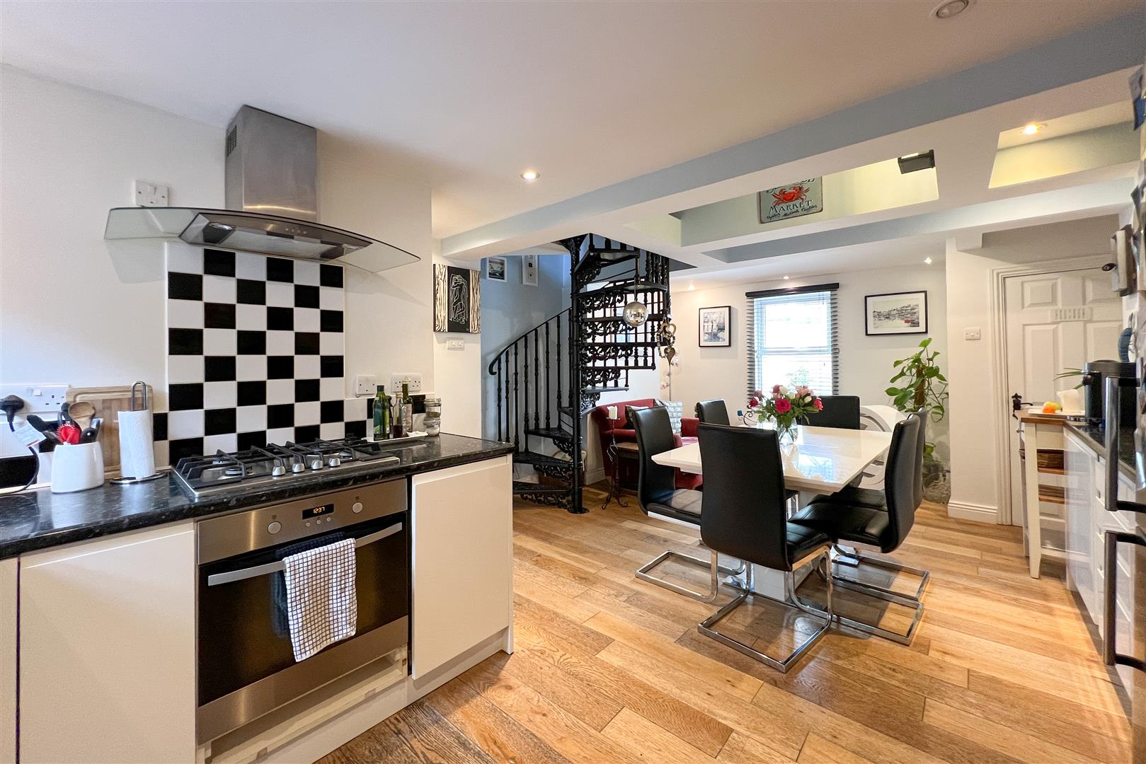 A spiral staircase leads down to a good sized double aspect kitchen/breakfast room which is well fitted, appointed and has access to a useful walk in larder and cloakroom with cupboard housing the gas boiler for central heating and hot water. a door to the rear provides access to the garden.